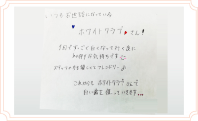 - 大きく堂々と自信を持って 笑顔を作ることができるようになりました! お茶やコーヒーを飲むのではなく、お水を飲むようになり、歯の着色を気にして、歯へのいたわりを行動にうつすようになりました。