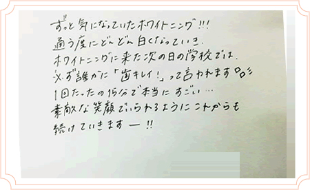 - 友達に歯がきれいと言われるようになり、写真を撮る時にも歯を気にして口を閉じて笑うことがなくなりました。自分に自信が持てるようになりました。