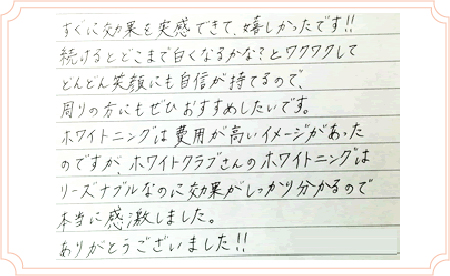 - 今まで人前で笑っても歯を気にしたりしてたんですけれど、歯が白くなって、自分に自信も持てて、笑うことになにも気にすることがなくなりました。