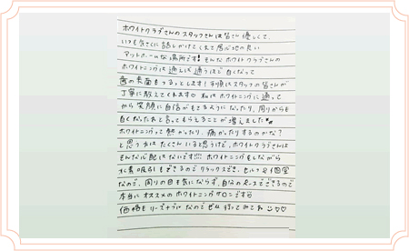 - 歯が白い人の笑顔はすごくきれいだと思うので、もっと笑顔に自信が持てるようにホワイト二ングしたいと思いました。